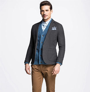 ○ 领形:平驳领设计,领底印花面料拼接与LOGO皮牌